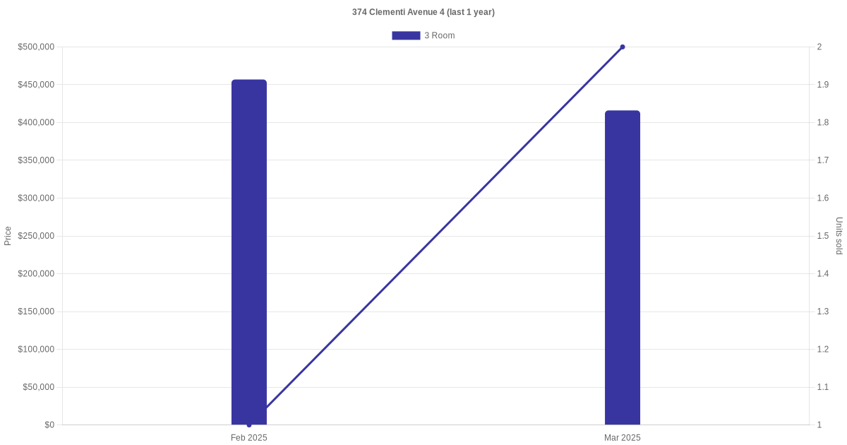 | Jul 2025 | $4,600 | 3 Room | Blk 374 Clementi Avenue 4 3 Room | Clementi |