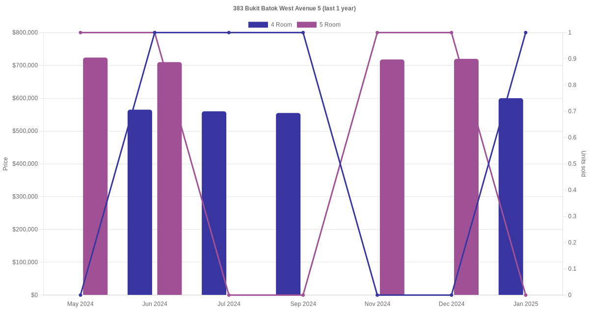Below is a quick summary of the resale transactions volume and average price trends for the 4 room and 5 room units at 383 Bukit Batok West Avenue 5.