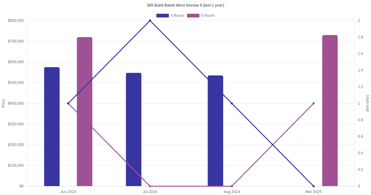 Below is a quick summary of the resale transactions volume and average price trends for the 4 room and 5 room units at 385 Bukit Batok West Avenue 5.