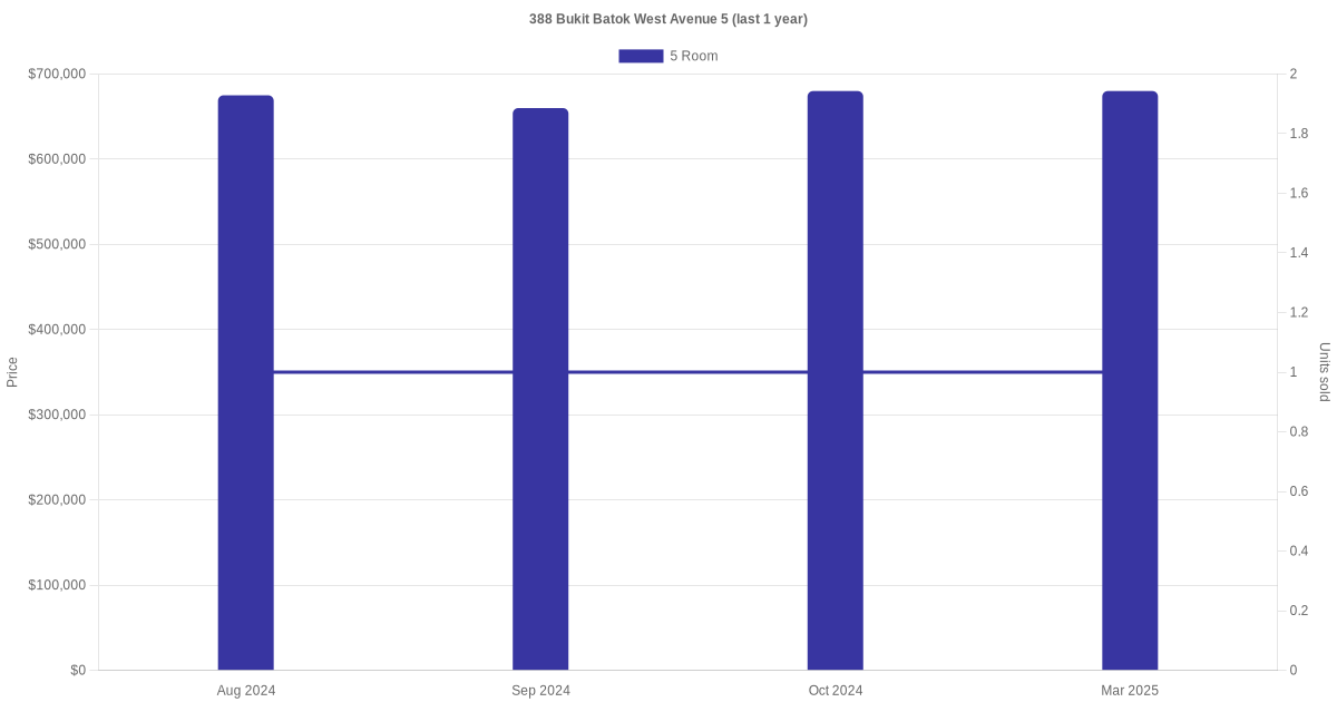 Below is a quick summary of the resale transactions volume and average price trends for the 5 room units at 388 Bukit Batok West Avenue 5.