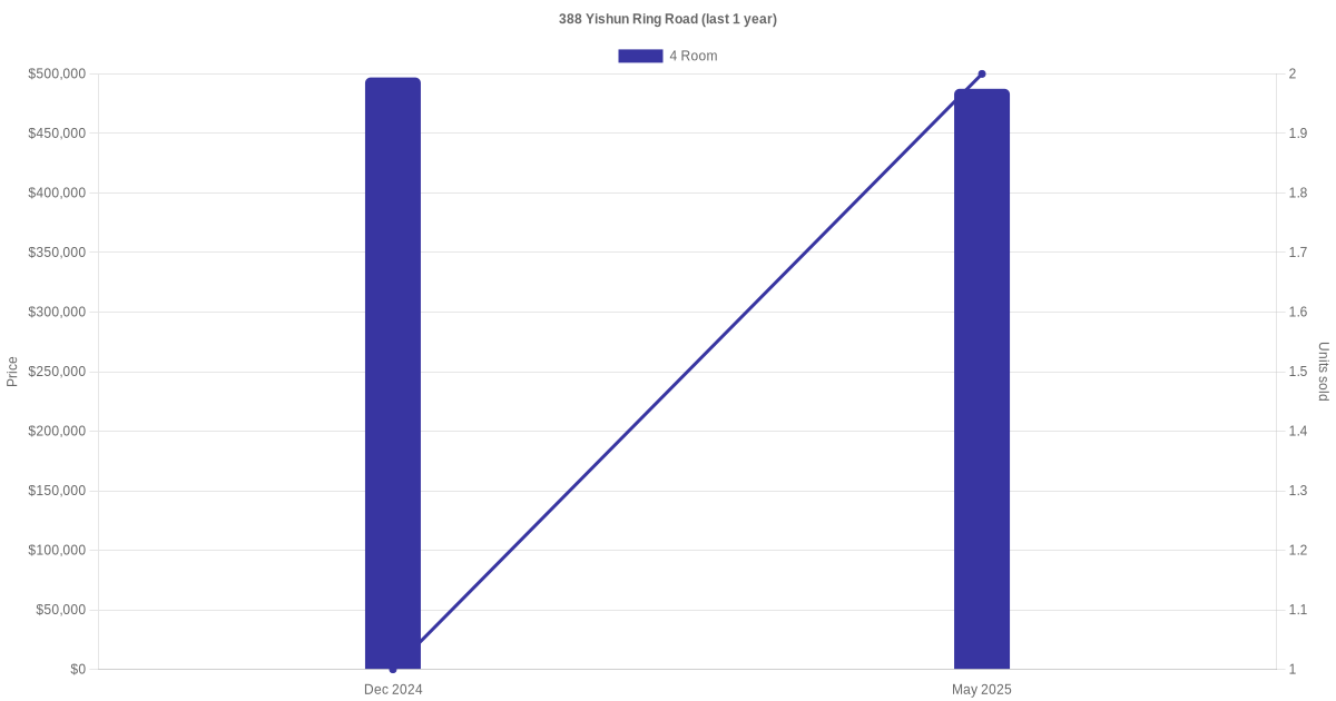Below is a quick summary of the resale transactions volume and average price trends for the 4 room units at 388 Yishun Ring Road.