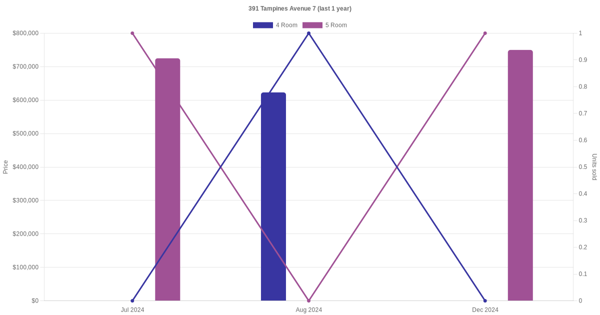 Below is a quick summary of the resale transactions volume and average price trends for the 4 room and 5 room units at 391 Tampines Avenue 7.