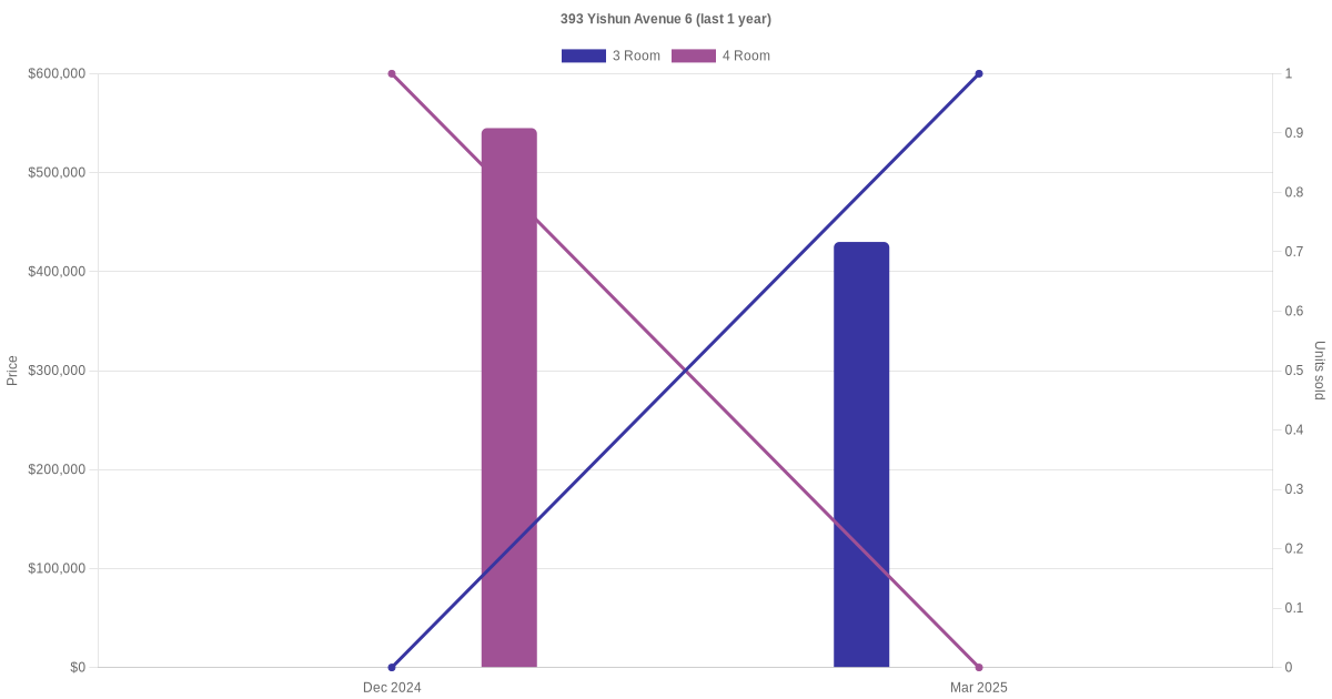 Below is a quick summary of the resale transactions volume and average price trends for the 3 room and 4 room units at 393 Yishun Avenue 6.