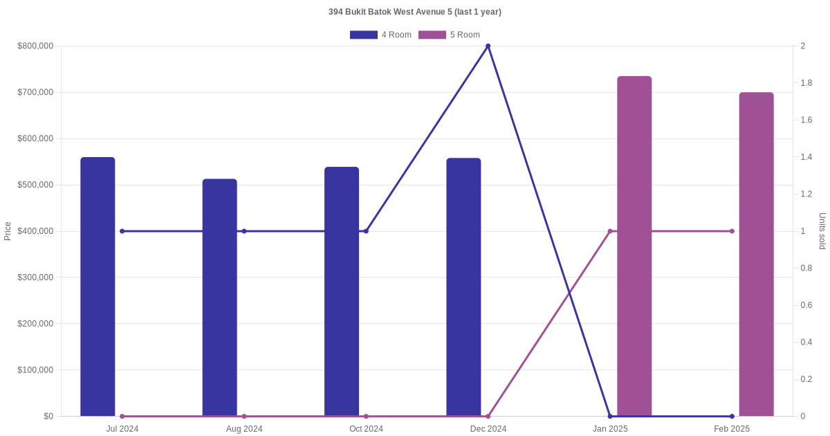 Below is a quick summary of the resale transactions volume and average price trends for the 4 room and 5 room units at 394 Bukit Batok West Avenue 5.