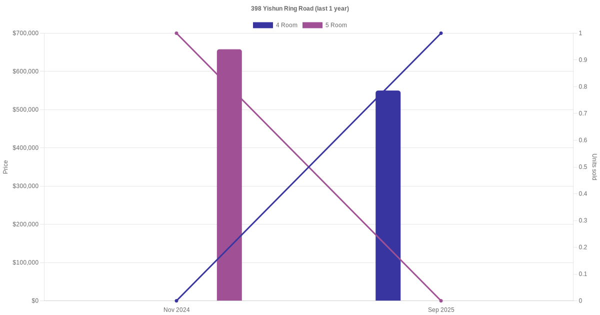 There were a total of 4 resale transactions in the last 3 years for units in block 398 Yishun Ring Road, with the latest one recorded in Dec 2025.