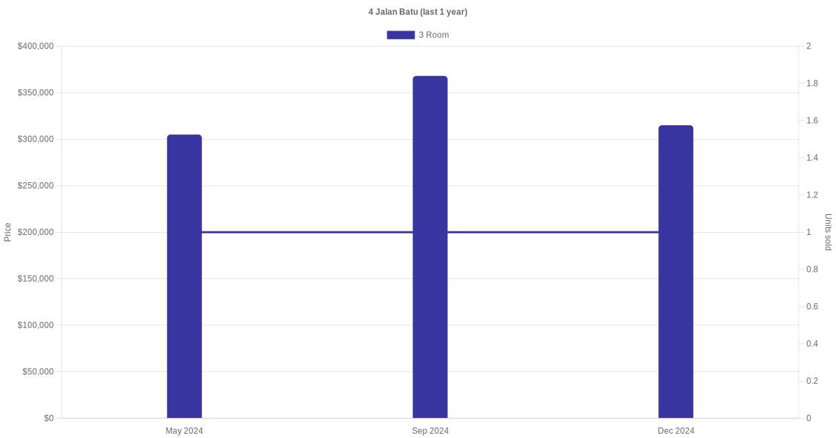 Below is a quick summary of the resale transactions volume and average price trends for the 3 room units at 4 Jalan Batu.