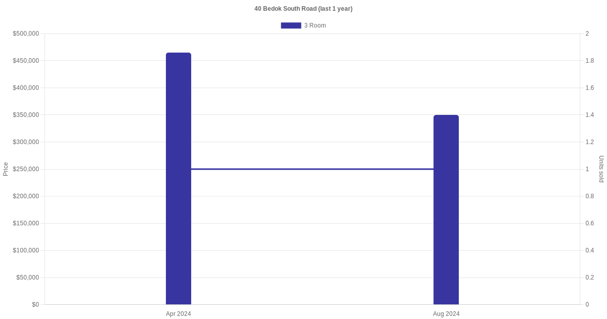Below is a quick summary of the resale transactions volume and average price trends for the 3 room units at 40 Bedok South Road.