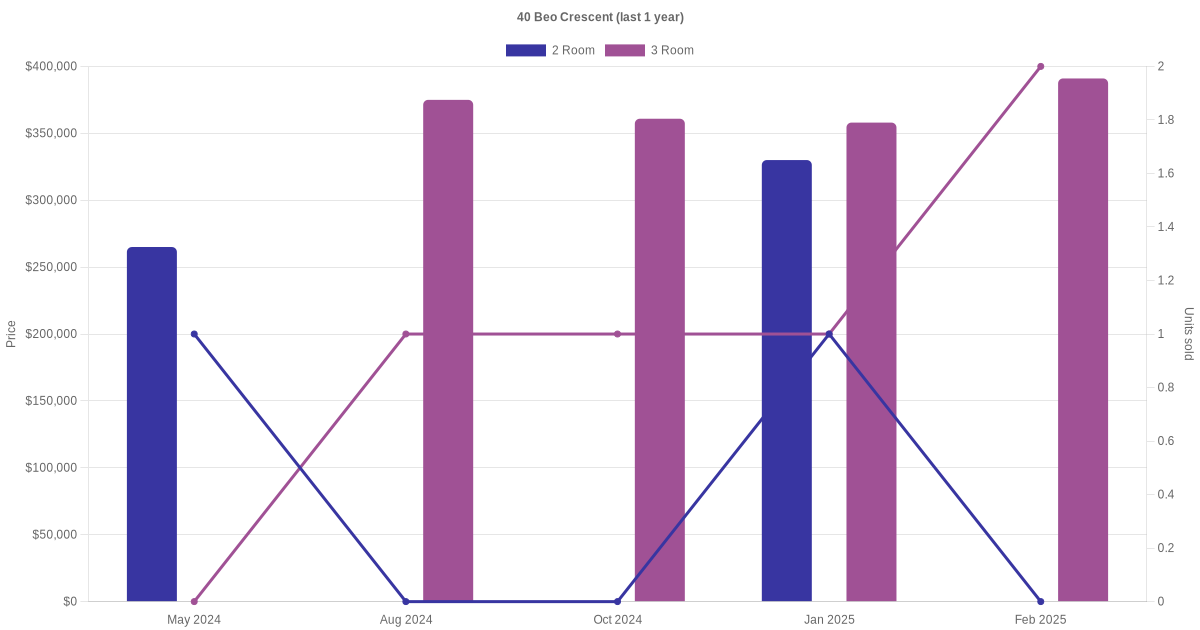 Below is a quick summary of the resale transactions volume and average price trends for the 2 room and 3 room units at 40 Beo Crescent.