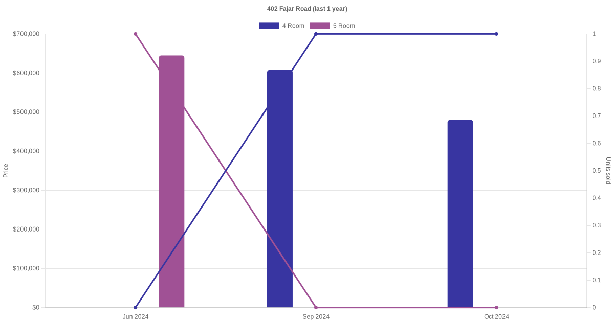 Below is a quick summary of the resale transactions volume and average price trends for the 4 room and 5 room units at 402 Fajar Road.