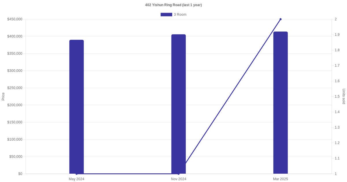 There were a total of 9 resale transactions in the last 3 years for units in block 402 Yishun Ring Road, with the latest one recorded in Jan 2026.