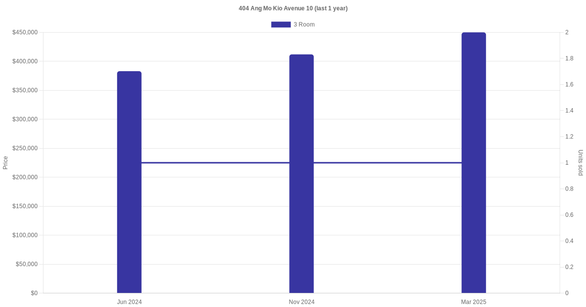 Below is a quick summary of the resale transactions volume and average price trends for the 3 room units at 404 Ang Mo Kio Avenue 10.