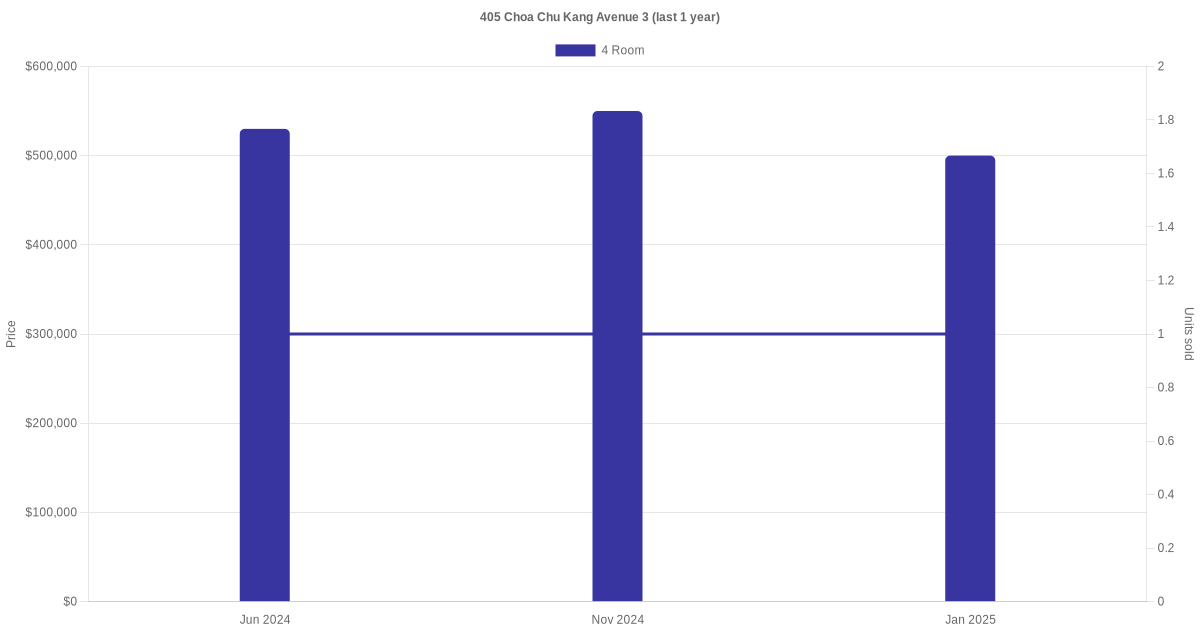 There were a total of 4 resale transactions in the last 3 years for units in block 405 Choa Chu Kang Avenue 3, with the latest one recorded in Jan 2025.