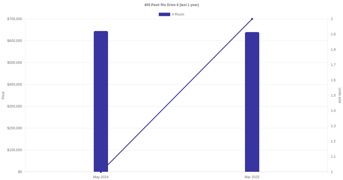 Below is a quick summary of the resale transactions volume and average price trends for the 4 room and 5 room units at 405 Pasir Ris Drive 6.