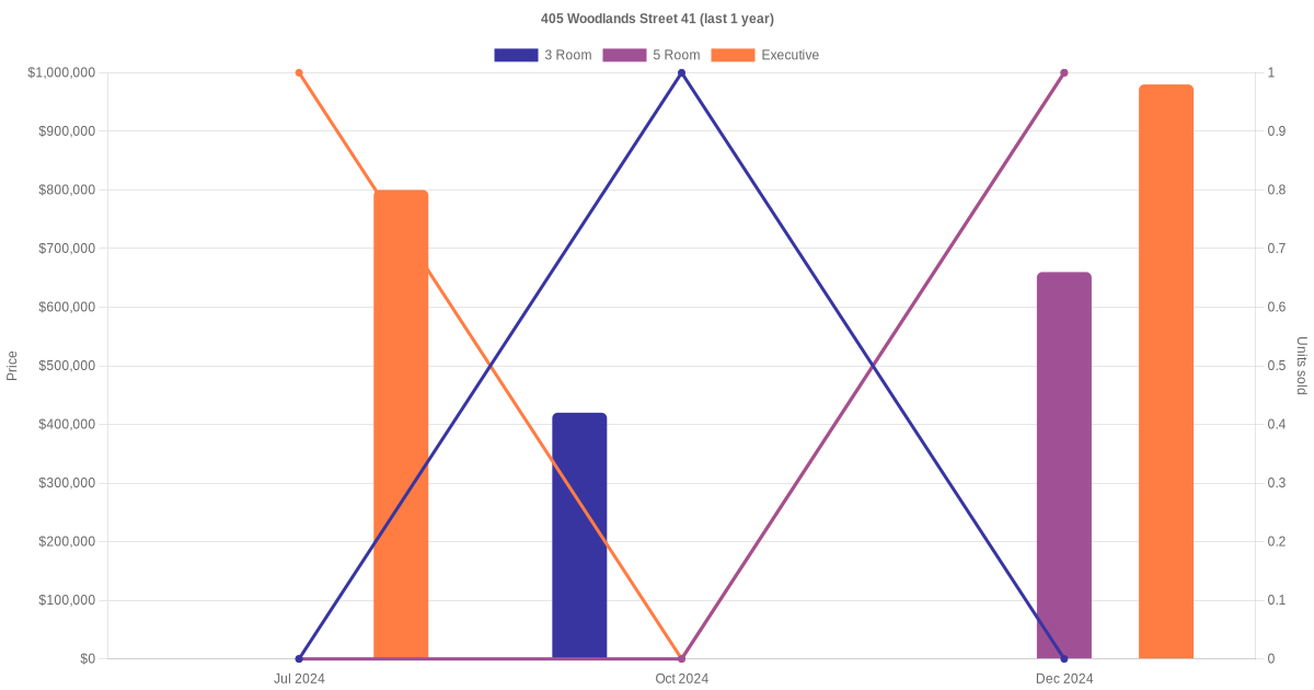 Here's a summary of the rental transactions and price trends for the 3 room, 5 room and executive units at 405 Woodlands Street 41.