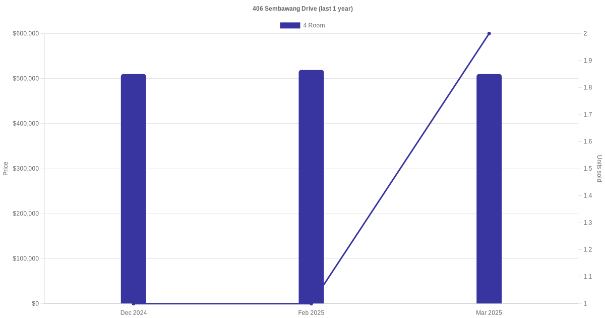 Below is a quick summary of the resale transactions volume and average price trends for the 4 room units at 406 Sembawang Drive.