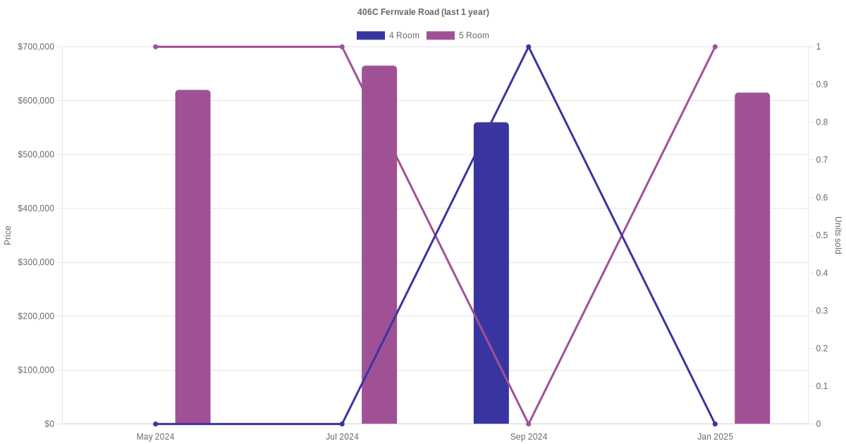 Below is a quick summary of the resale transactions volume and average price trends for the 4 room and 5 room units at 406C Fernvale Road.