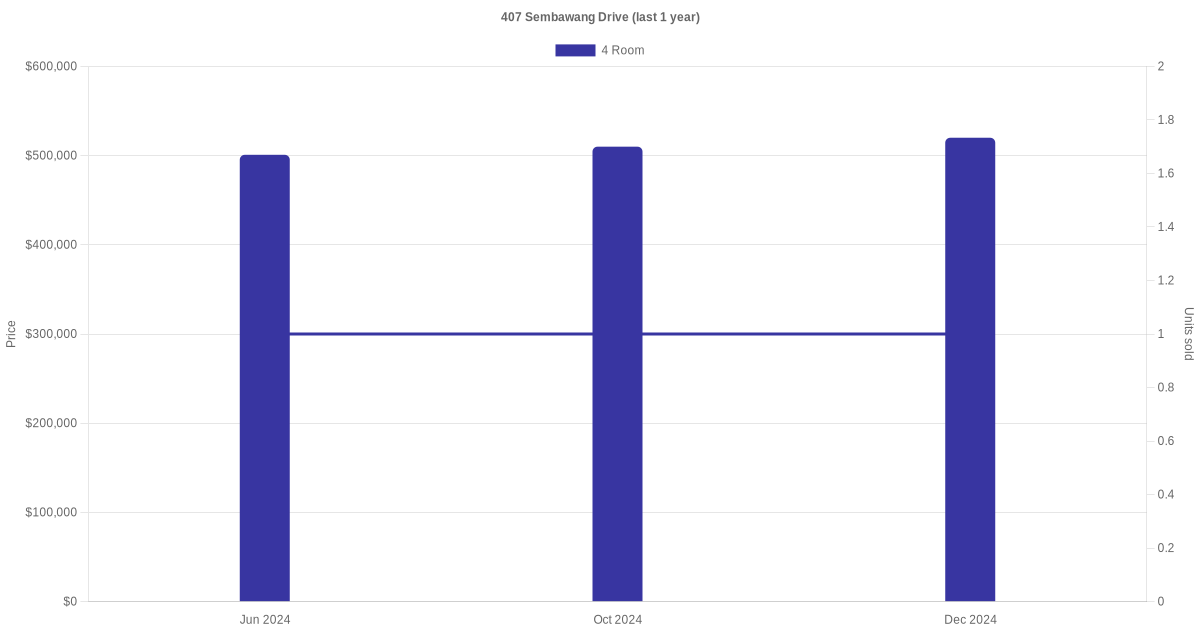Below is a quick summary of the resale transactions volume and average price trends for the 4 room and 5 room units at 407 Sembawang Drive.