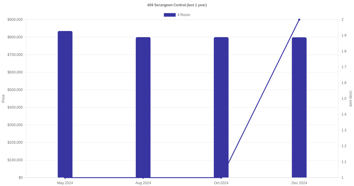 Below is a quick summary of the resale transactions volume and average price trends for the 4 room and 5 room units at 409 Serangoon Central.