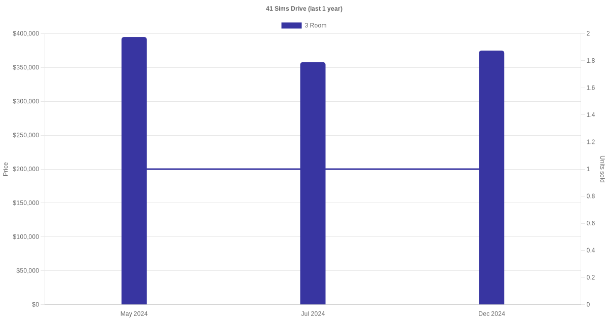 Below is a quick summary of the resale transactions volume and average price trends for the 3 room units at 41 Sims Drive.