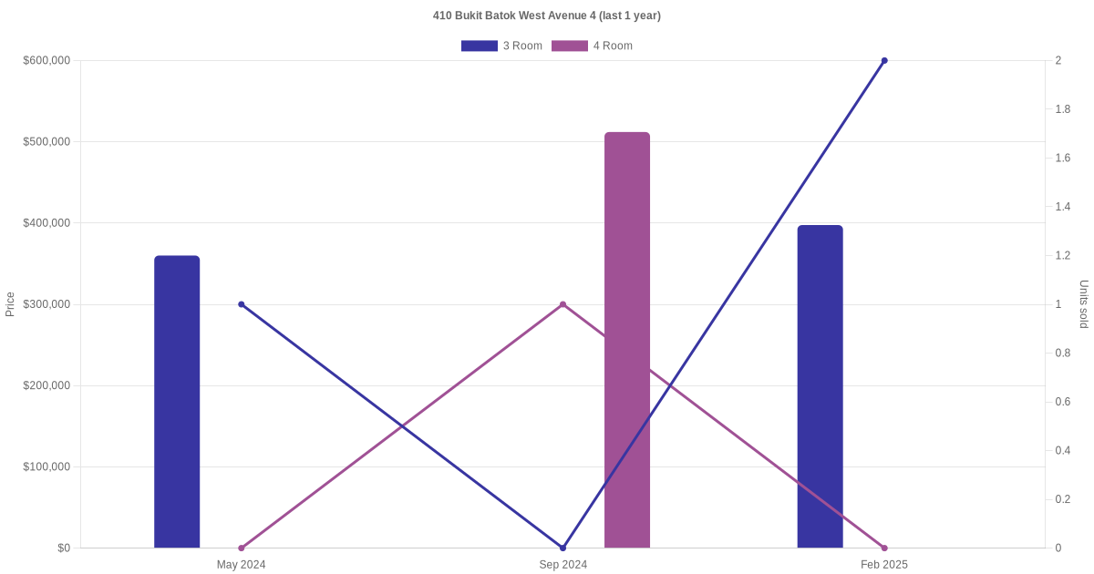 Below is a quick summary of the resale transactions volume and average price trends for the 3 room and 4 room units at 410 Bukit Batok West Avenue 4.