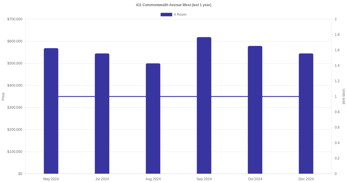 Below is a quick summary of the resale transactions volume and average price trends for the 4 room units at 411 Commonwealth Avenue West.