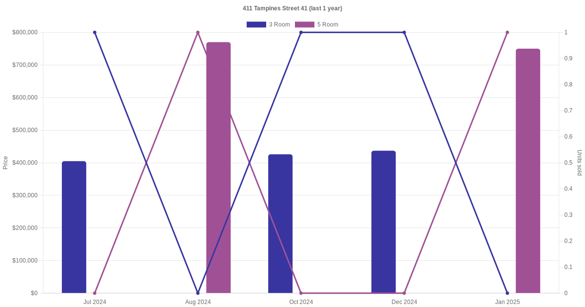 Below is a quick summary of the resale transactions volume and average price trends for the 3 room and 5 room units at 411 Tampines Street 41.