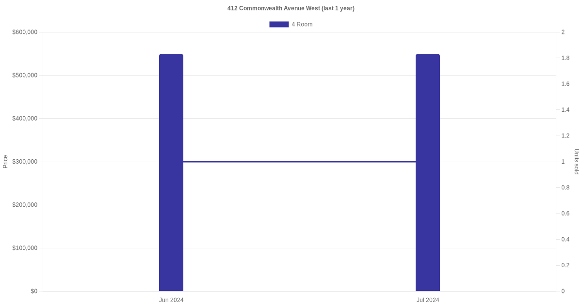 Below is a quick summary of the resale transactions volume and average price trends for the 4 room units at 412 Commonwealth Avenue West.
