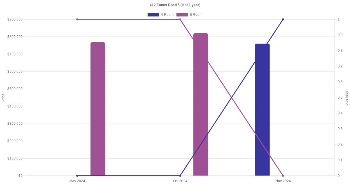 Below is a quick summary of the resale transactions volume and average price trends for the 4 room and 5 room units at 412 Eunos Road 5.