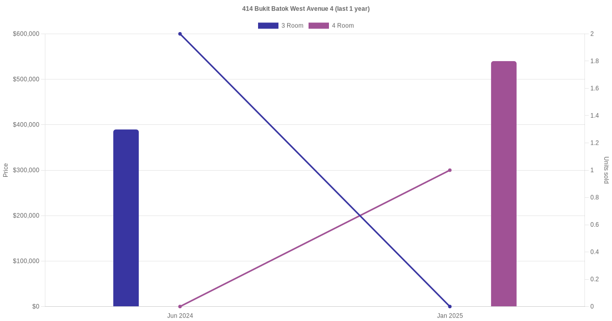 Below is a quick summary of the resale transactions volume and average price trends for the 3 room and 4 room units at 414 Bukit Batok West Avenue 4.