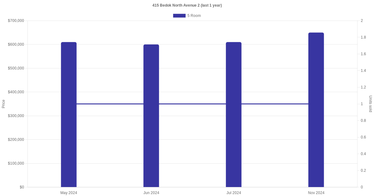 Below is a quick summary of the resale transactions volume and average price trends for the 5 room units at 415 Bedok North Avenue 2.