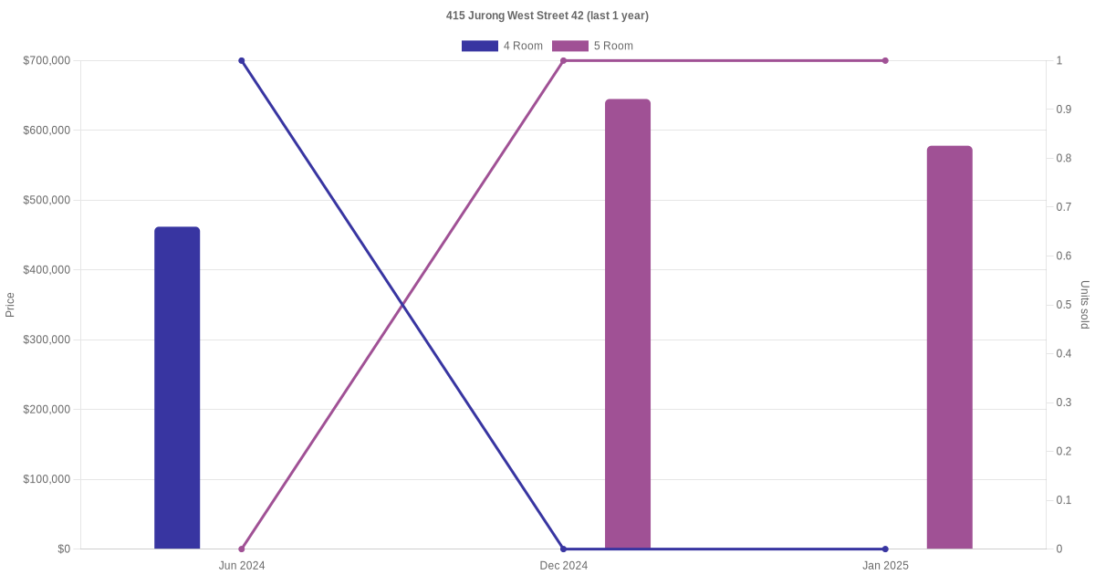 Below is a quick summary of the resale transactions volume and average price trends for the 4 room and 5 room units at 415 Jurong West Street 42.
