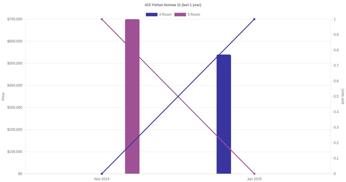 Below is a quick summary of the resale transactions volume and average price trends for the 4 room and 5 room units at 415 Yishun Avenue 11.
