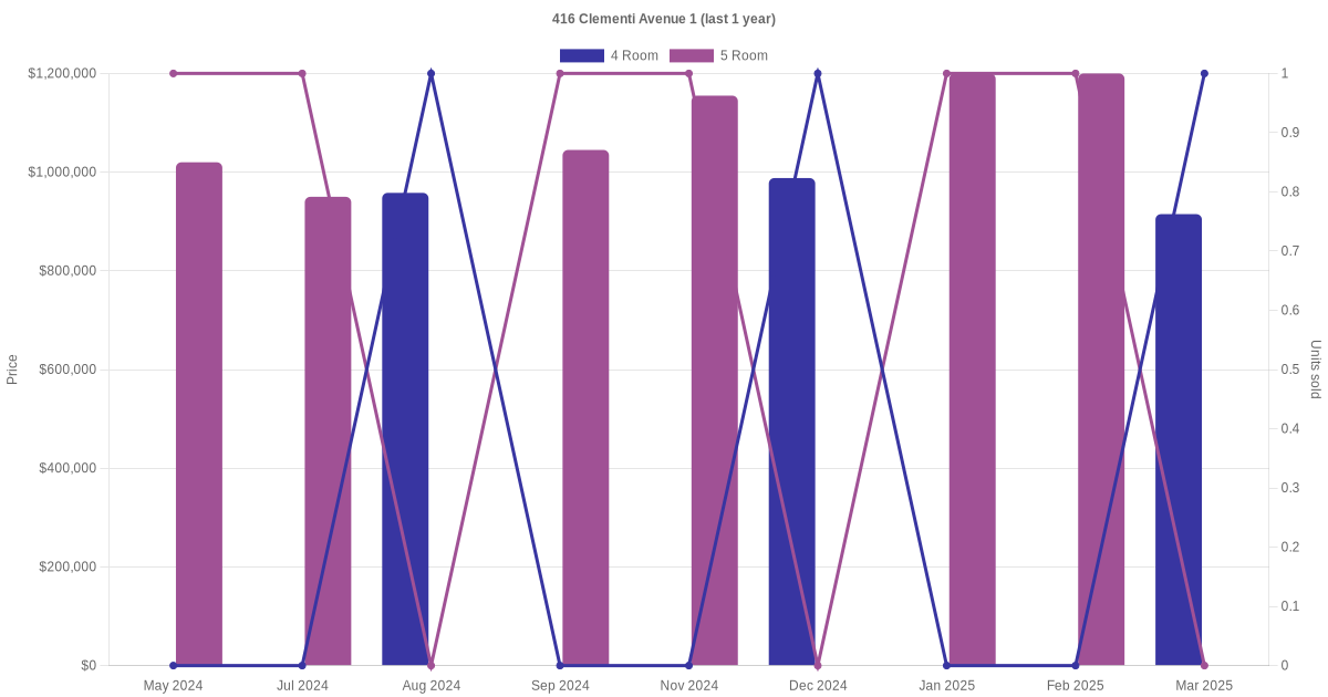 Below is a quick summary of the resale transactions volume and average price trends for the 4 room and 5 room units at 416 Clementi Avenue 1.