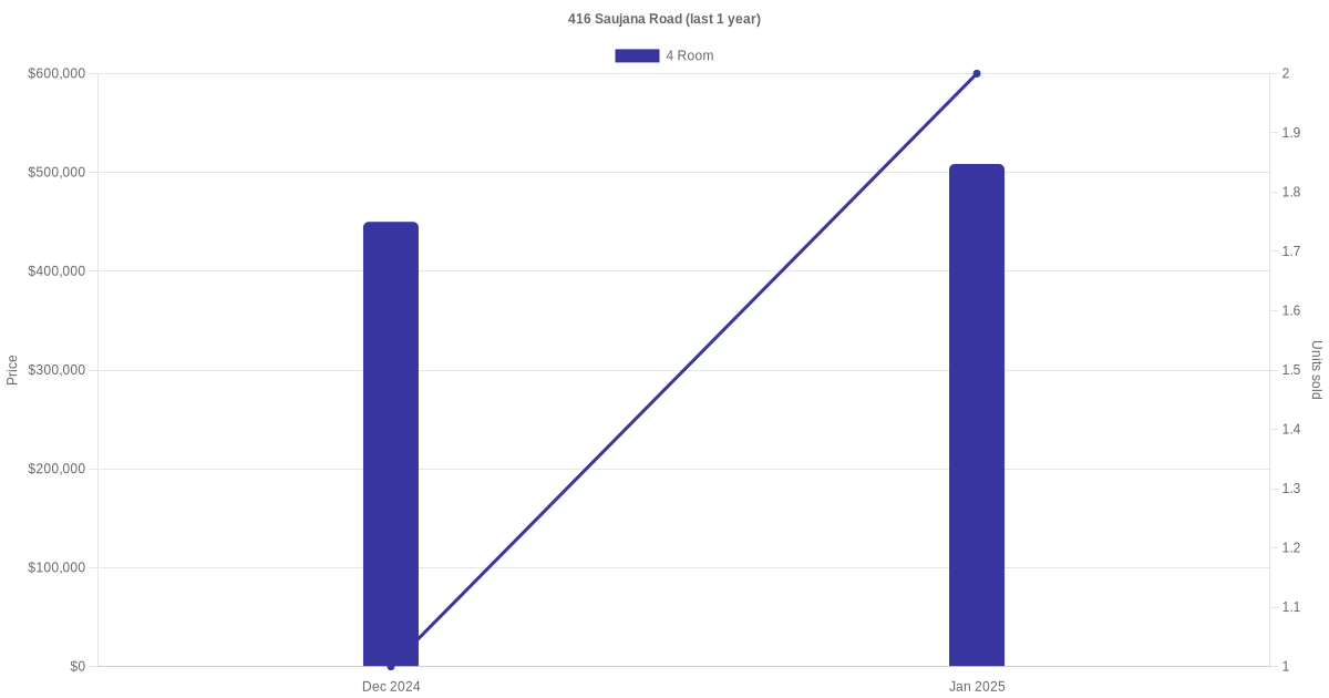 Below is a quick summary of the resale transactions volume and average price trends for the 4 room units at 416 Saujana Road.