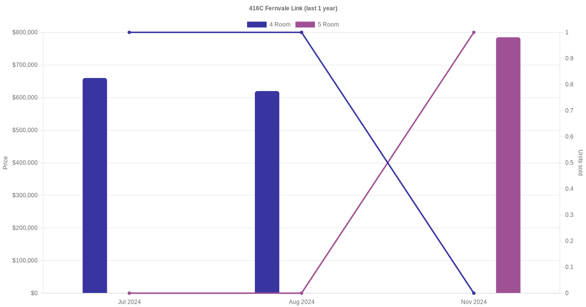 Below is a quick summary of the resale transactions volume and average price trends for the 4 room and 5 room units at 416C Fernvale Link.