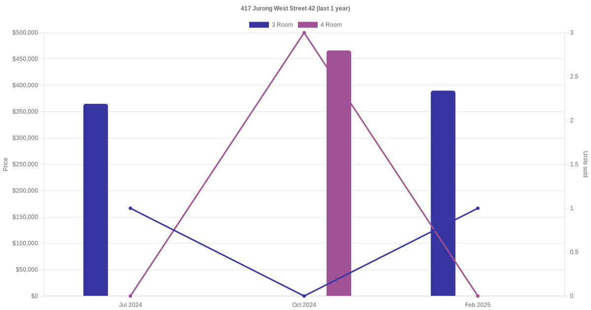 Below is a quick summary of the resale transactions volume and average price trends for the 3 room and 4 room units at 417 Jurong West Street 42.