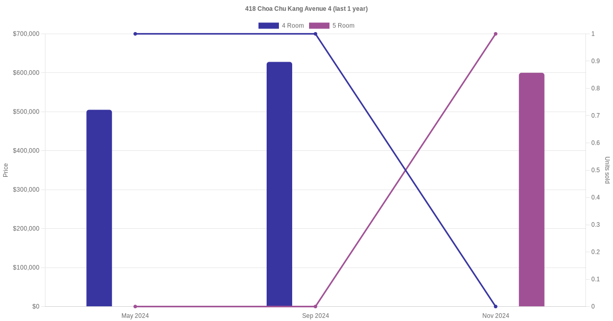 Below is a quick summary of the resale transactions volume and average price trends for the 4 room and 5 room units at 418 Choa Chu Kang Avenue 4.