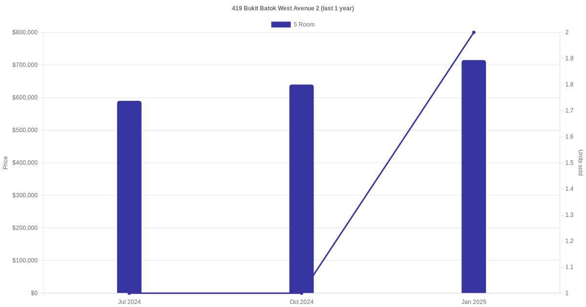Below is a quick summary of the resale transactions volume and average price trends for the 5 room units at 419 Bukit Batok West Avenue 2.