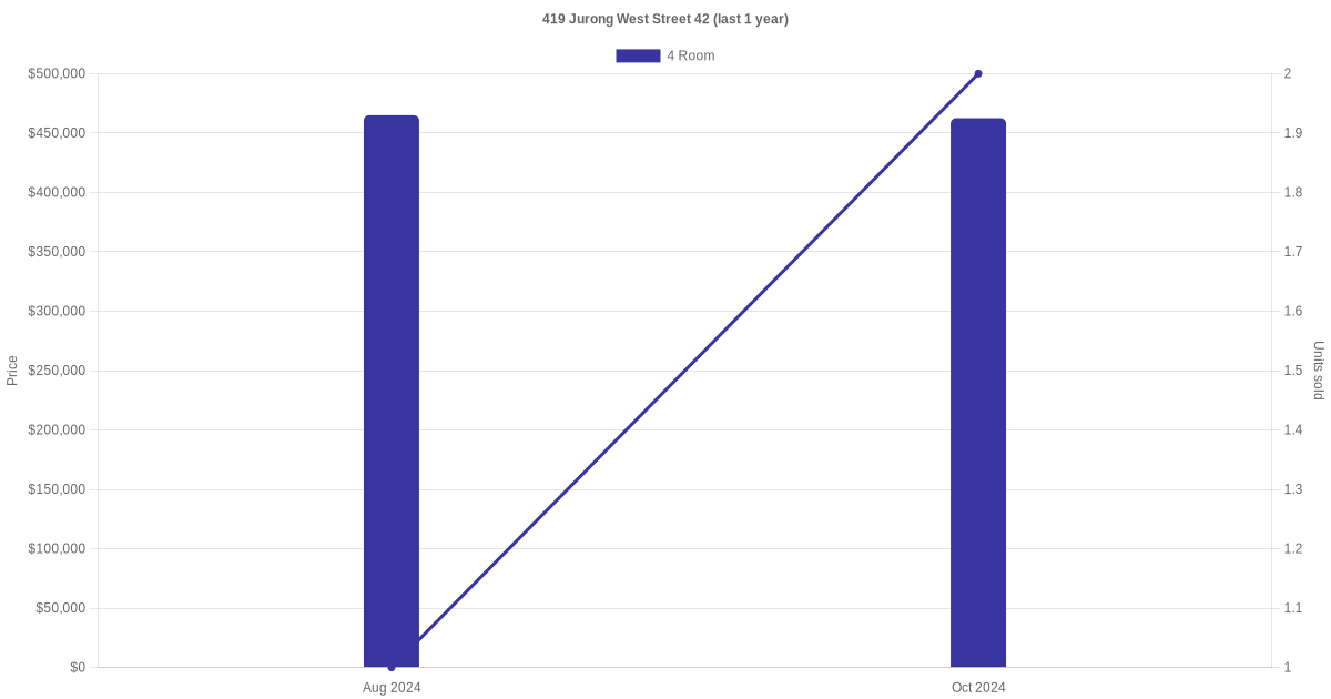 Below is a quick summary of the resale transactions volume and average price trends for the 4 room units at 419 Jurong West Street 42.