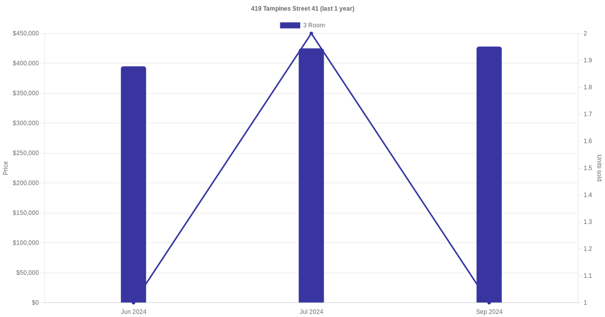 Below is a quick summary of the resale transactions volume and average price trends for the 3 room units at 419 Tampines Street 41.