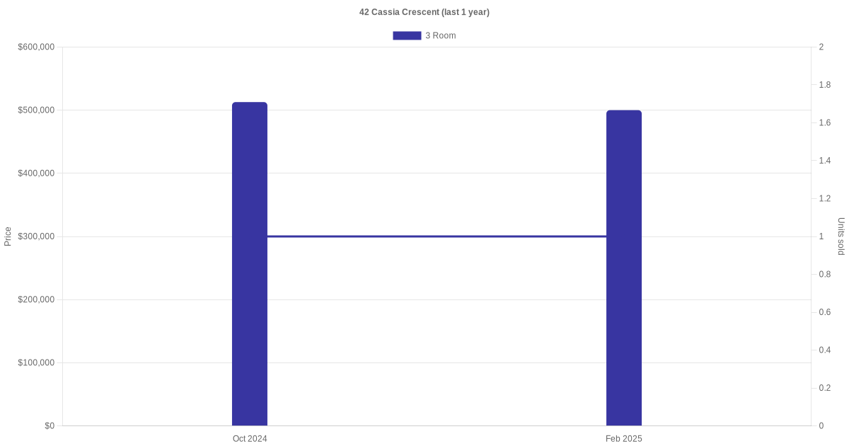 There were a total of 6 resale transactions in the last 3 years for units in block 42 Cassia Crescent, with the latest one recorded in Feb 2025.