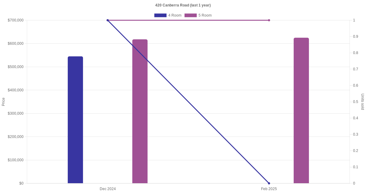 Below is a quick summary of the resale transactions volume and average price trends for the 4 room and 5 room units at 420 Canberra Road.