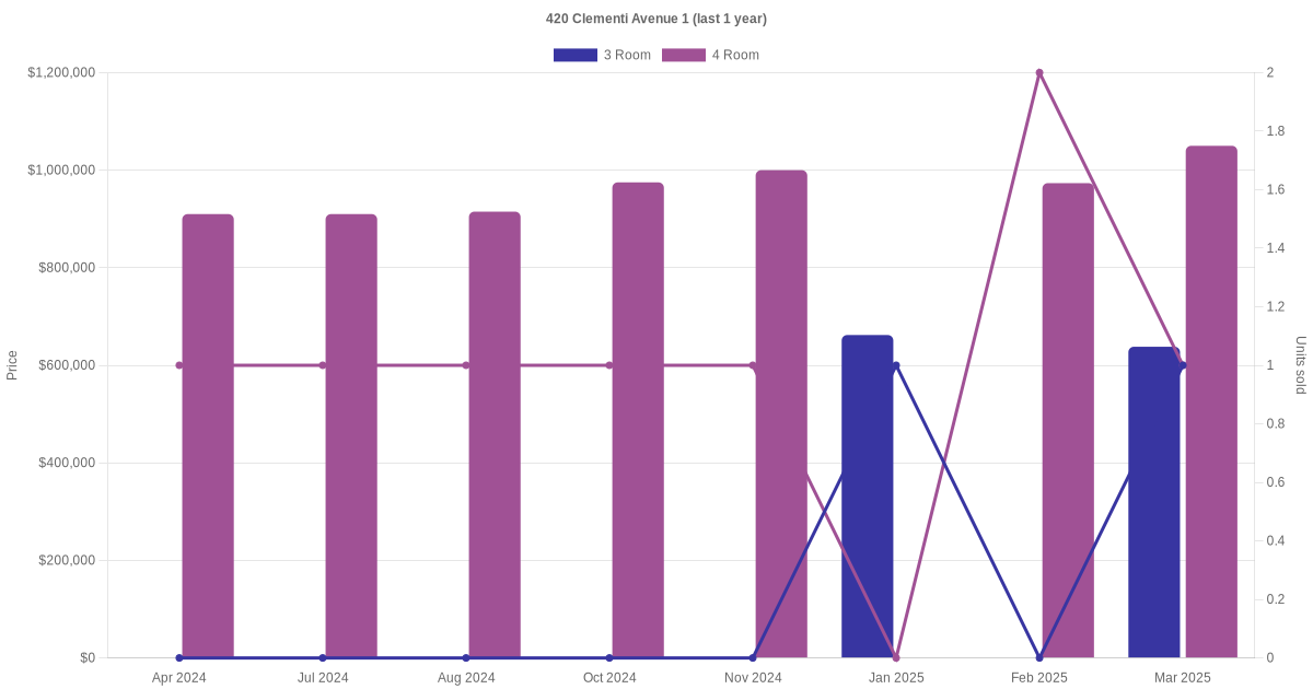 Below is a quick summary of the resale transactions volume and average price trends for the 3 room and 4 room units at 420 Clementi Avenue 1.