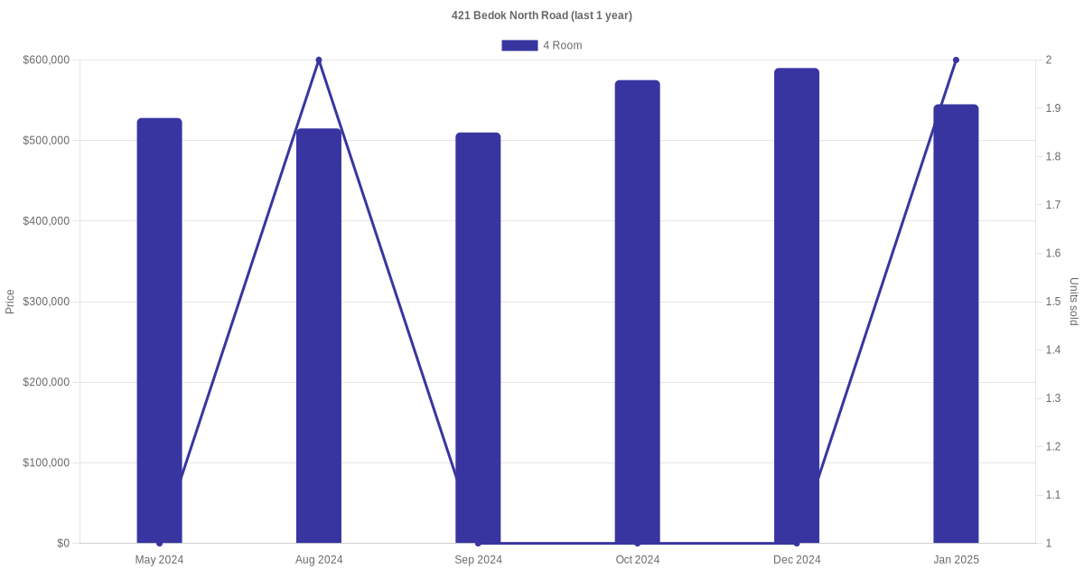 Below is a quick summary of the resale transactions volume and average price trends for the 4 room units at 421 Bedok North Road.