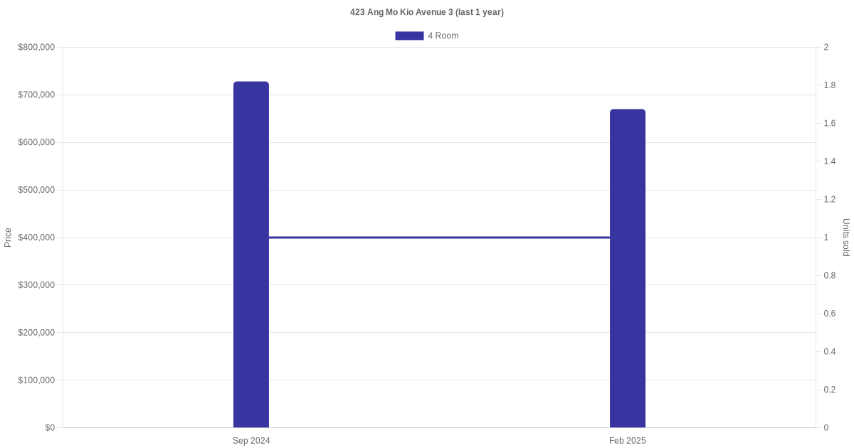 Below is a quick summary of the resale transactions volume and average price trends for the 4 room units at 423 Ang Mo Kio Avenue 3.