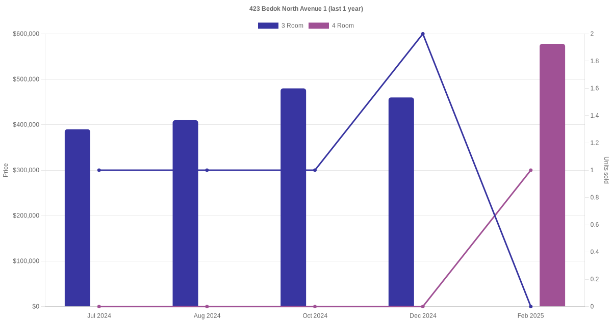 Below is a quick summary of the resale transactions volume and average price trends for the 3 room and 4 room units at 423 Bedok North Avenue 1.