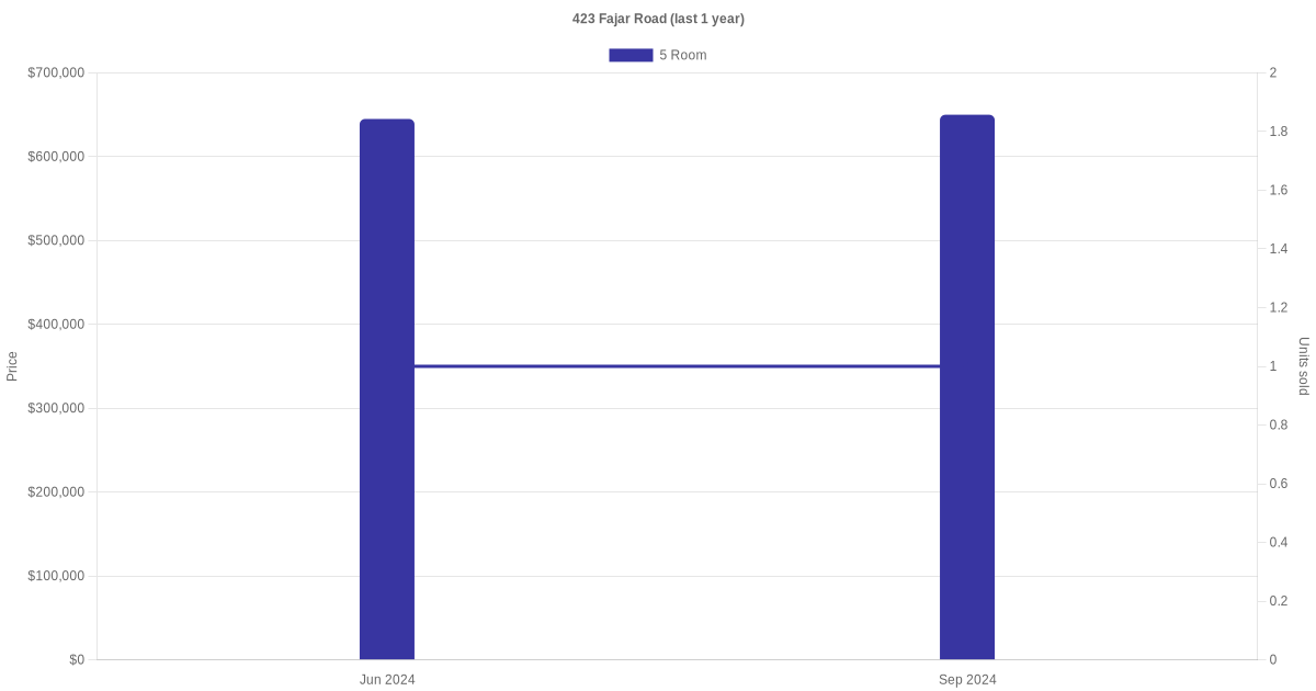 Below is a quick summary of the resale transactions volume and average price trends for the 5 room units at 423 Fajar Road.