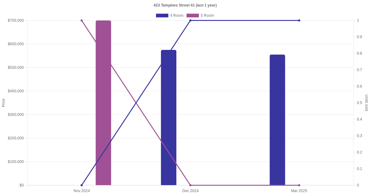 Below is a quick summary of the resale transactions volume and average price trends for the 4 room and 5 room units at 423 Tampines Street 41.