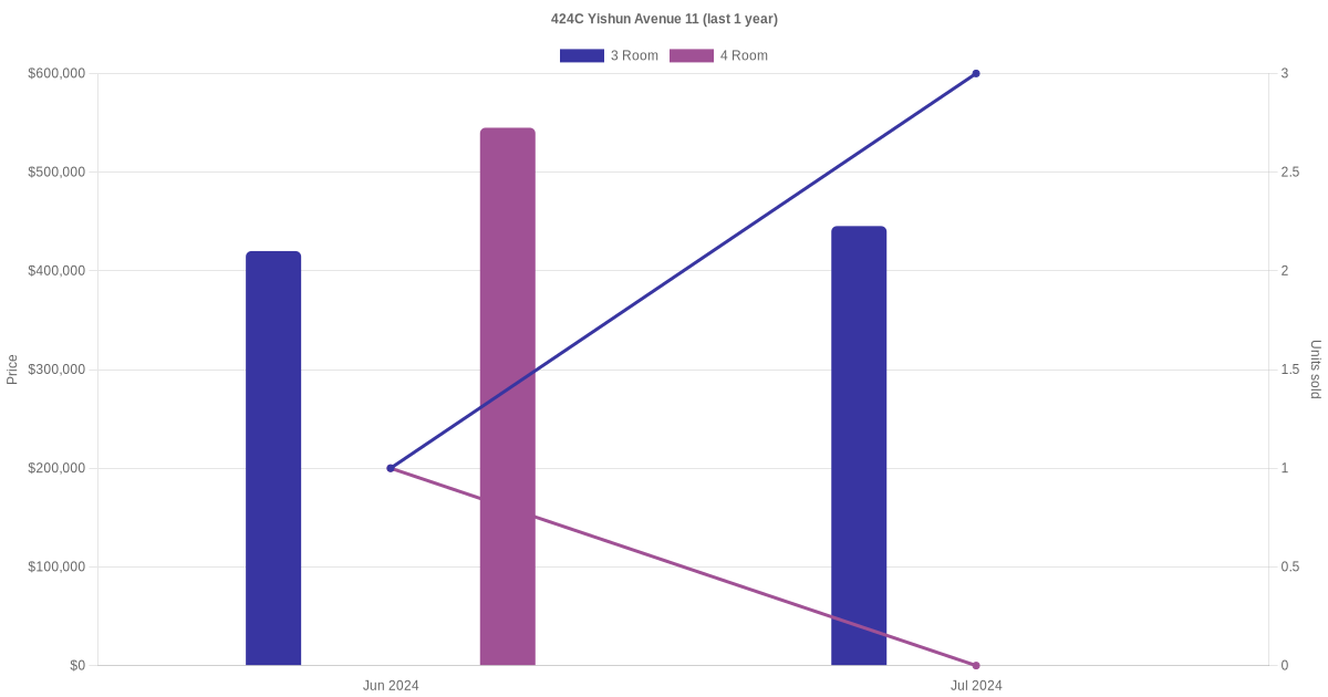 Below is a quick summary of the resale transactions volume and average price trends for the 3 room and 4 room units at 424C Yishun Avenue 11.