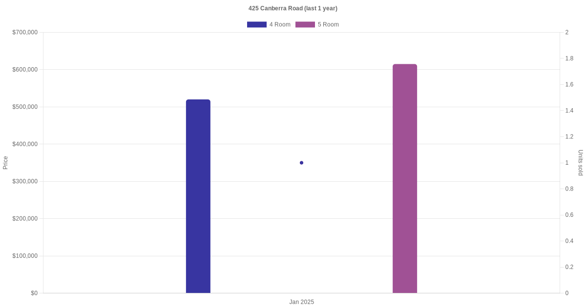 Below is a quick summary of the resale transactions volume and average price trends for the 4 room and 5 room units at 425 Canberra Road.